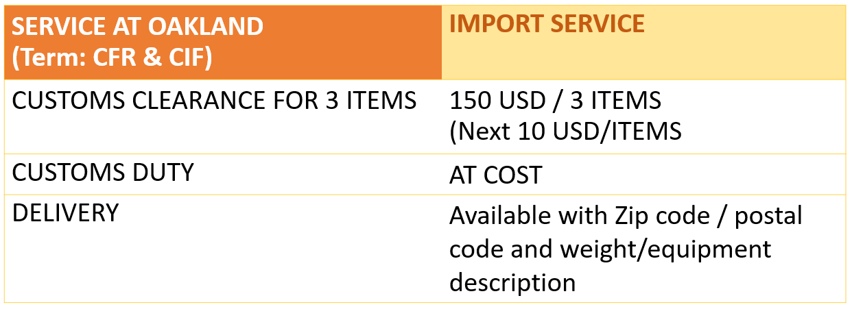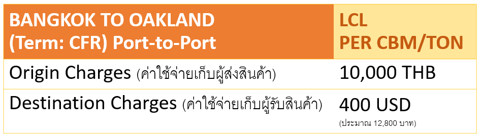 • ค่าบริการรวม ค่าขนส่งทางเรือจาก กรุงเทพ (ลานบรรจุลาดกระบัง) จนถึง คลังสินค้าโอ๊คแลนด์ แคลิฟอร์เนีย