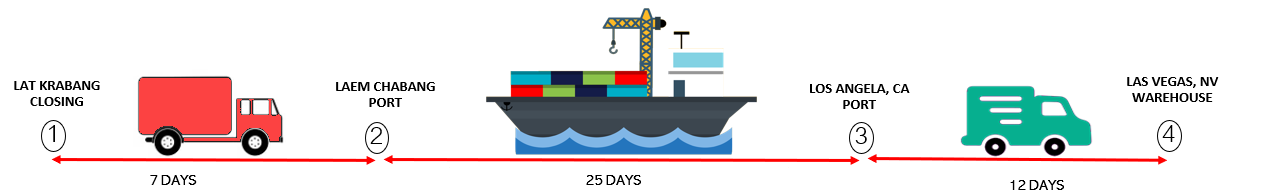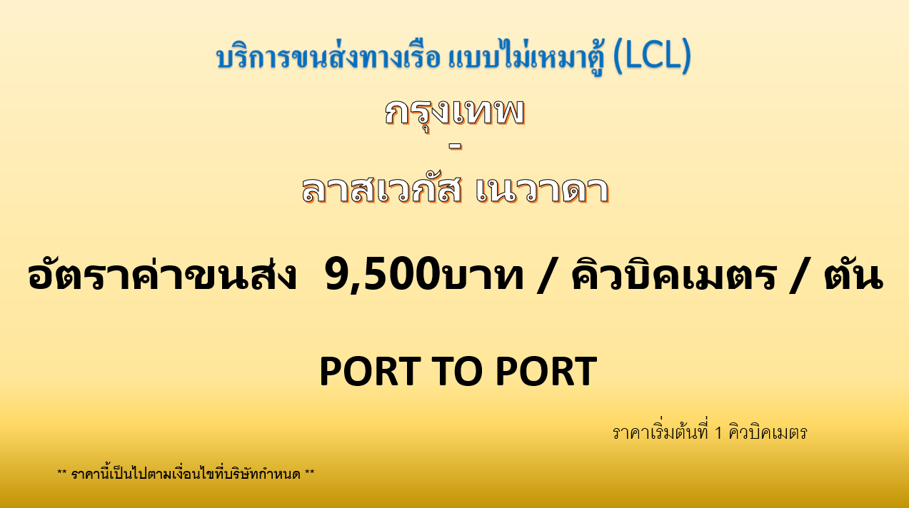 • ค่าบริการรวม ค่าขนส่งทางเรือจาก กรุงเทพ (ลานบรรจุลาดกระบัง) จนถึง คลังสินค้าลาสเวกัส, เนวาดา