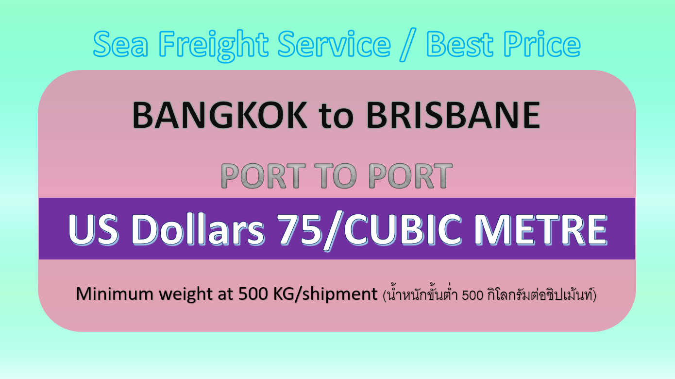 • ค่าบริการรวม ค่าขนส่งทางเรือจากกรุงเทพ (ลานบรรจุสินค้าลาดกระบัง) จนถึง ท่าเรือปลายทาง (ท่าเรือบริสเบน)