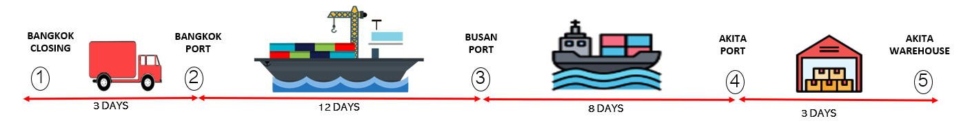 • ค่าบริการรวม ค่าขนส่งทางเรือจาก ท่าเรือกรุงเทพ จนถึง ท่าเรือปลายทาง (ท่าเรืออะกิตะ)