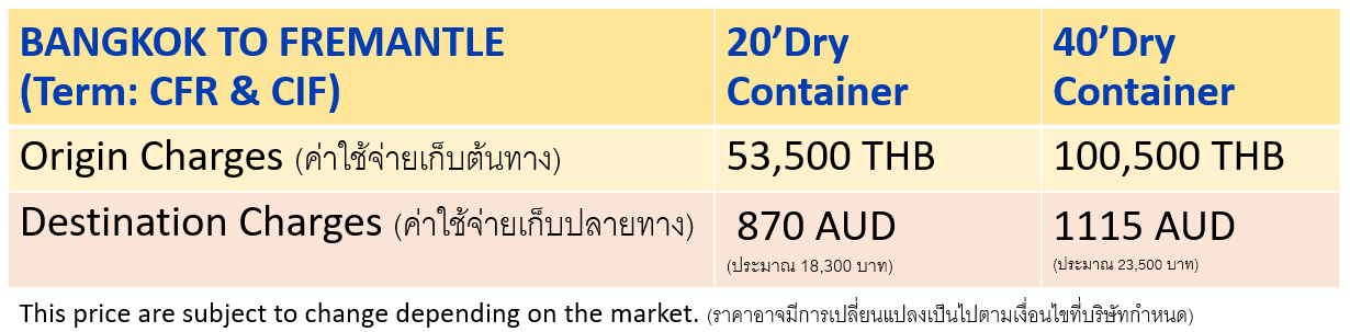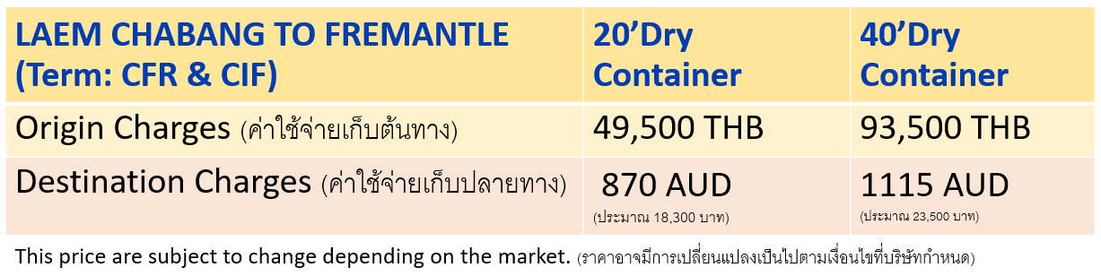 รายละเอียดการขนส่ง : มีเรือออกทุกสัปดาห์ ระยะเวลาในการขนส่งโดยรวมประมาณ 26 วัน