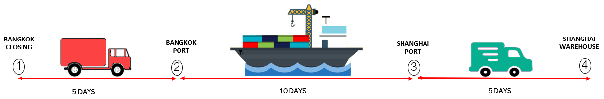 - เรือออกทุกสัปดาห์ ระยะเวลาในการขนส่งโดยรวมประมาณ 20 วัน
