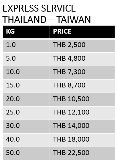 - Packing fees: minimum charge is THB 120 per box or 25 THB/KG.