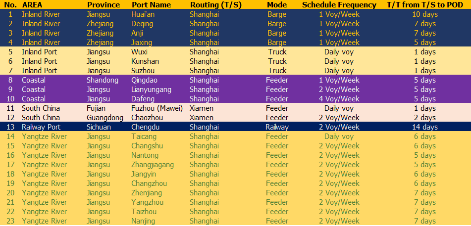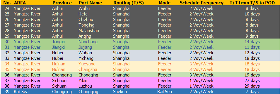 PODs China Inland: Huai'an, Deqing, Anji, Jiaxing, Wuxi, Kunshan, Suzhou, Qingdao, Lianyungang, Dafeng, Fuzhou (Mawei), Chaozhou, Chengdu, Taicang, Changshu, Nantong, Zhangjiagang, Jiangyin, Changzhou, Taizhou, Nanjing, Wuhu, Hefei, Chizhou, Tongling, Ma'anshan, Anqing, Nanchang, Jiujang, Wuhan, Yichang, YueYang, Changsha, Chongqing, Yibin, Luzhou, Chongqing