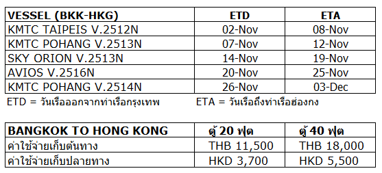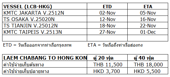 ขนส่งสินค้าทางเรือเต็มตู้ (FCL) กรุงเทพ / แหลมฉบัง- ฮ่องกง (1-30 พฤศจิกายน 2568) (180 อ่าน)