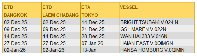 อัพเดทตารางเรือ กรุงเทพ & แหลมฉบัง - โตเกียว (FCL) Dec'2025 (1016 อ่าน)